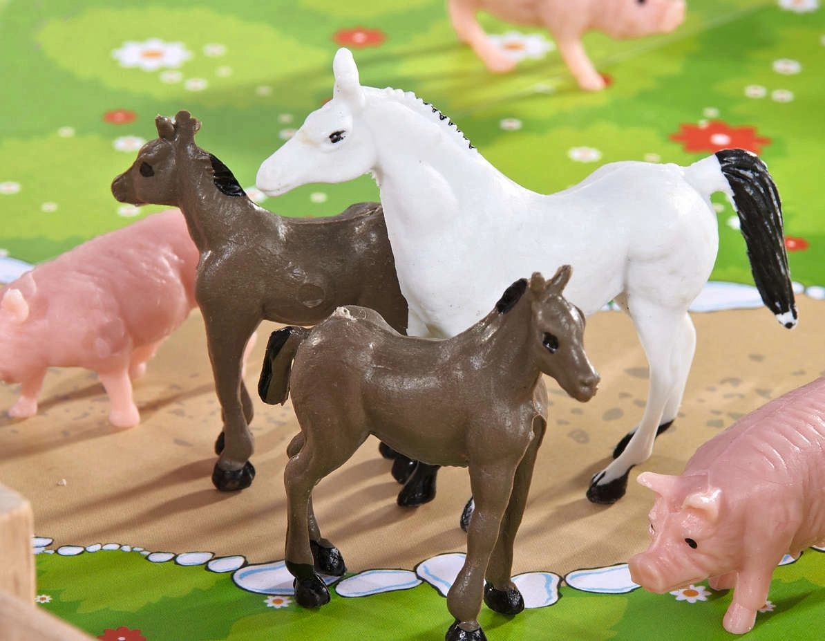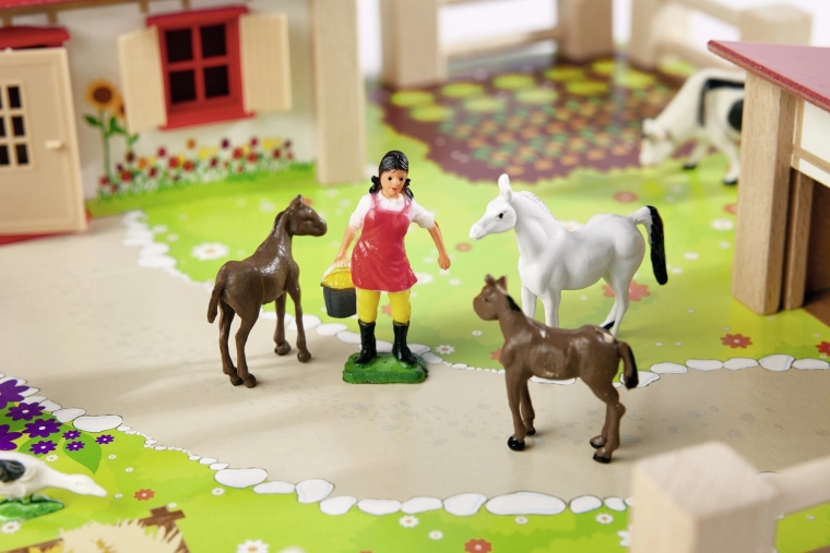 Konji, krave, pujsk,i gosi in skrbnica spodbujajo domišljijo, učijo otroke prepoznavati vrste živali ter razvijajo socialne veščine v okviru igre vlog.