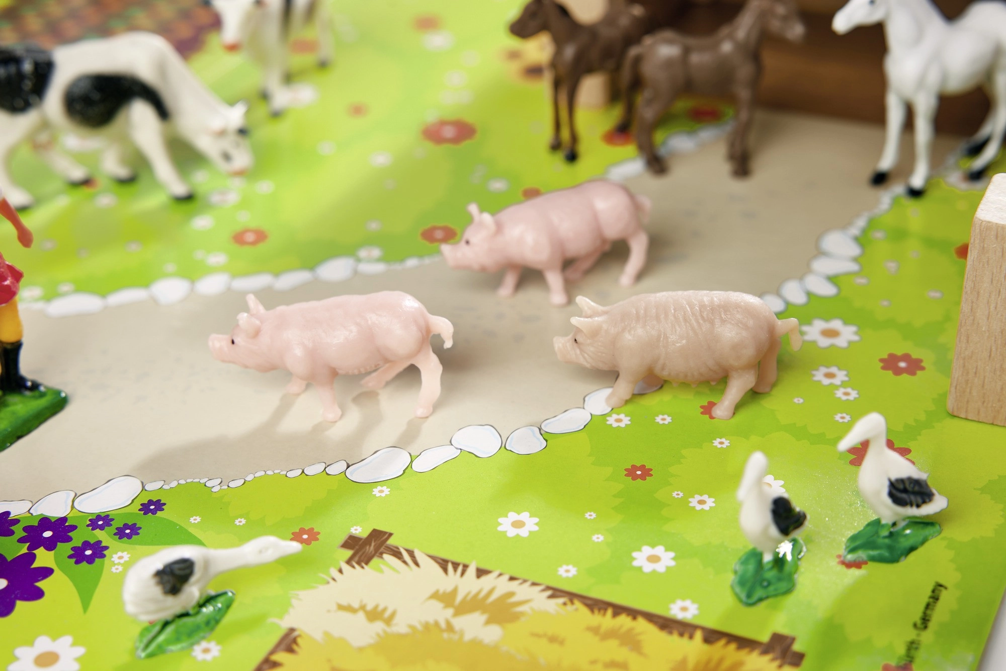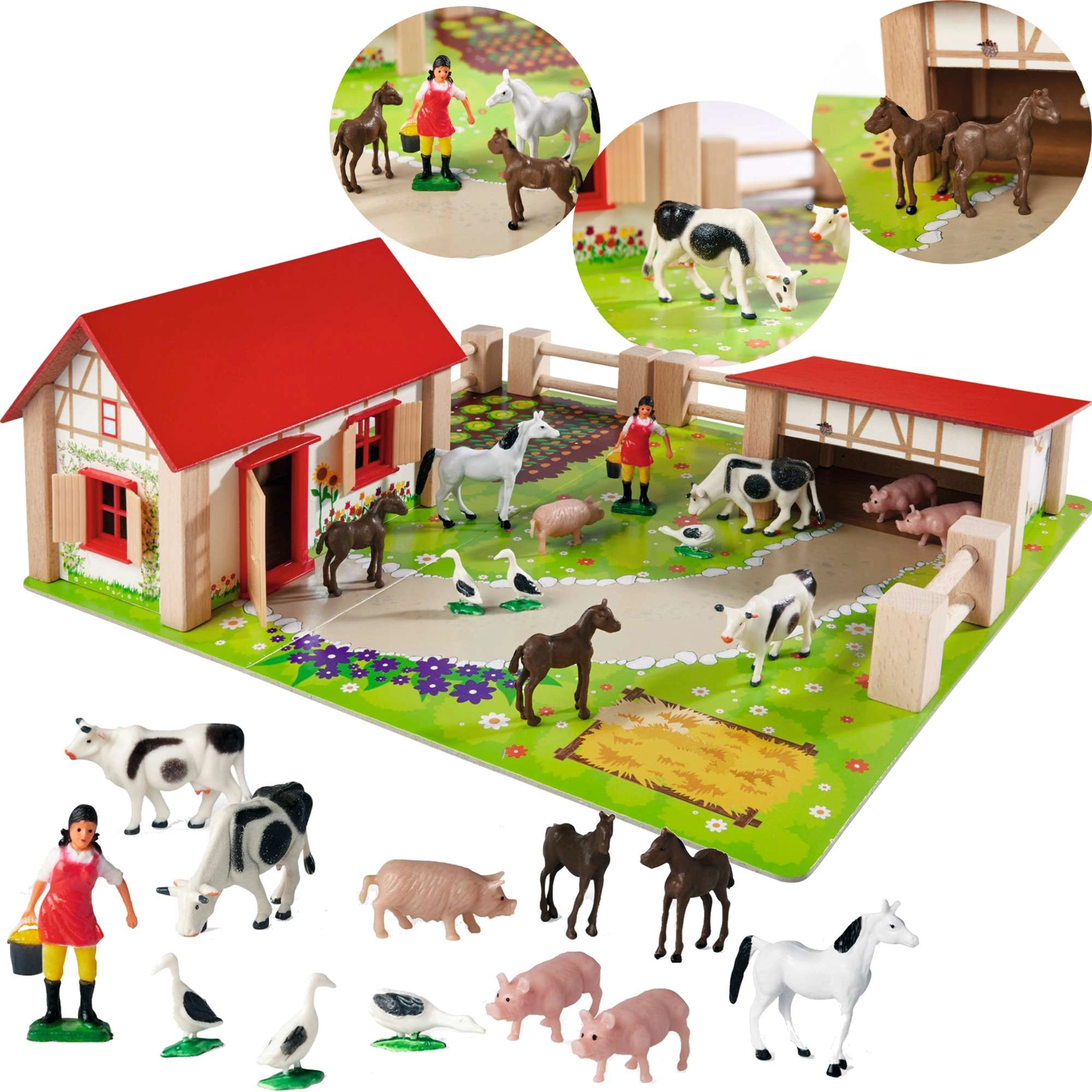 Podlaga s potkami, travo in vrtičkom ter povezljive ograje olajšajo postavitev izpustov in ustvarjanje lastnih kmečkih zgodb.