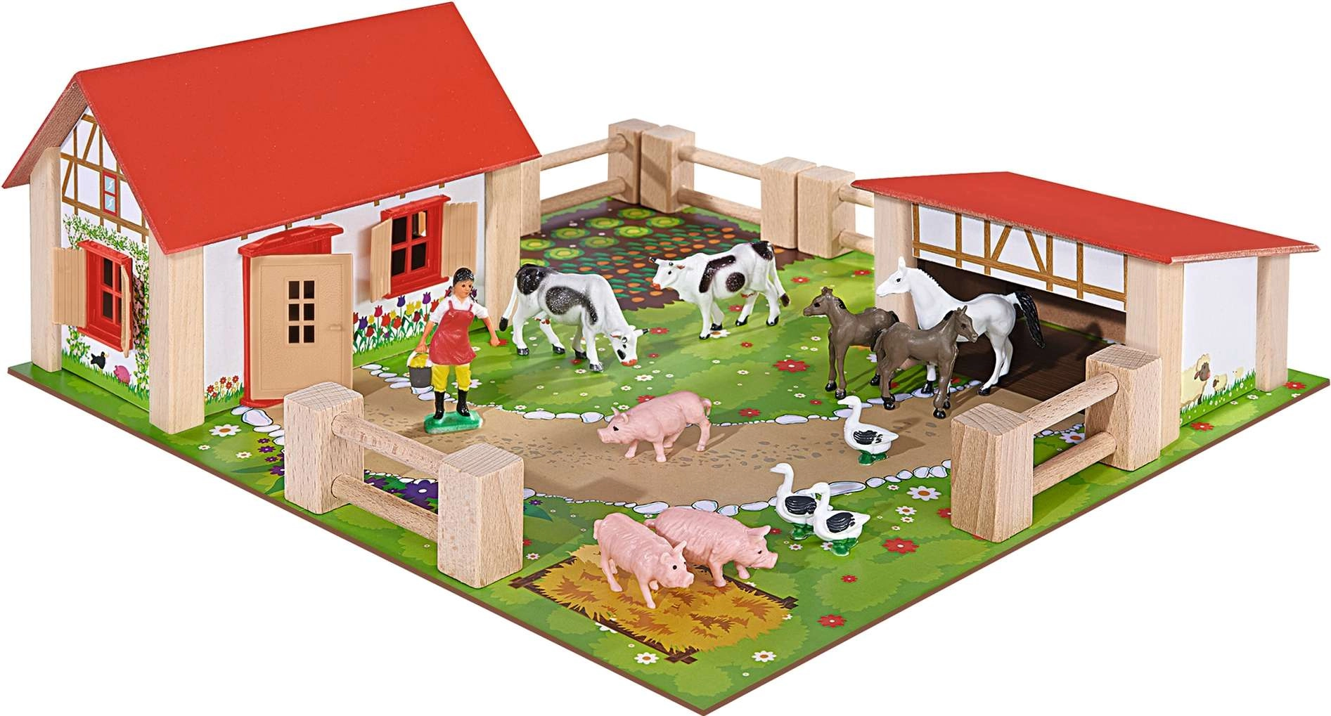 Hiška z odpirajočimi se vrati in okni ter prostoren hlev sta srce kmetije. Les nudi kompletu vzdržljivost in avtentičen videz za dolge ure igre.