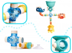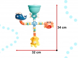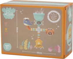 Barvita vodna steza z motivi morskih živalic spremeni vsako kopel v odkrivanje. Vlijte vodo v zgornji lijak in tok aktivira povezane cevčice, zavrti kolesca in požene figurice – zabava, ki pritegne pozornost otrok in polepša vsakodnevno kopanje.