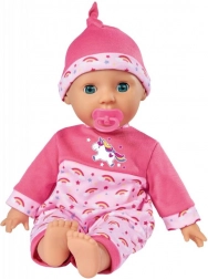 Punčka je oblečena v rožnat komplet z motivom samoroga, kar jo naredi za prikupen igralni predmet za otroke.