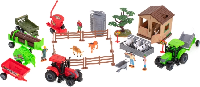 Zložljiv hlev, 2 traktorja, 3 prikolice/nastavki (npr. sejalnica, balirka, prikolica za bale), silos, drevo, 8 lesenih ograjnih elementov, 8 spojk (podstavkov) za ograjo, 6 zidakov, korito/napajalnik, figurice kmetov, živali, opozorilne table in drugi dodatki