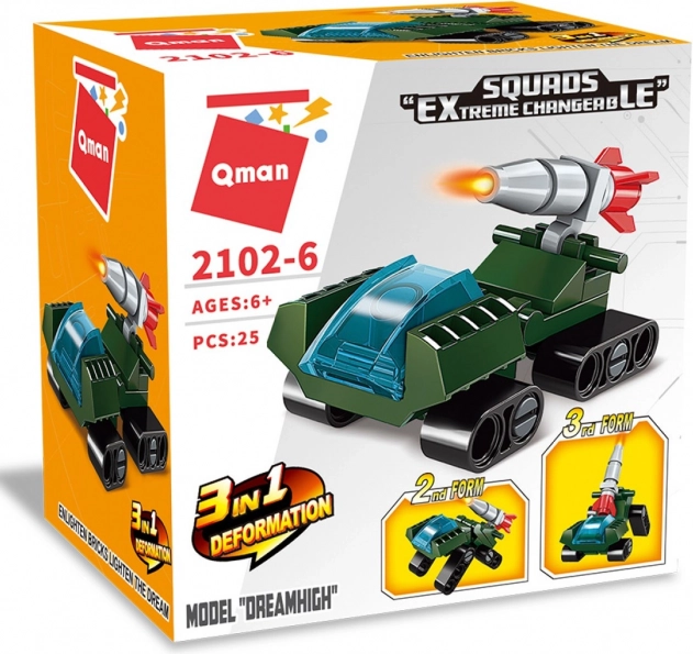 Mini sestavljanka Qman ponuja odlično razmerje med zabavo in raznolikostjo v majhnem paketu. Zahvaljujoč konceptu 3 v 1 otroci zlahka sestavijo različne modele – od malega tanka do akcijskega vozila – in jih lahko kadarkoli preoblikujejo. Set razvija fino motoriko, prostorsko predstavljivost in ustvarjalnost.
