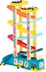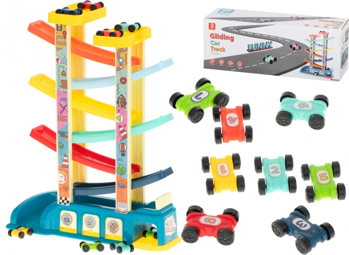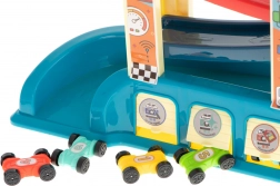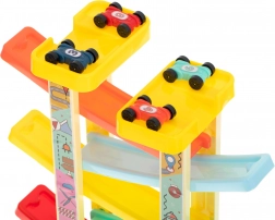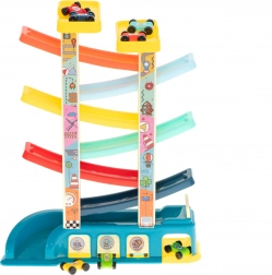 Pripravljeni, pozor, start! Kateri izmed pisanih avtomobilčkov bo prvi v cilju? Večnadstropna dirkalna steza zagotavlja dinamičen spust z atraktivnimi preskoki med nadstropji in gladko vožnjo vse do dna. Start se lahko začne na dveh ravneh – z najvišjega ali drugega nadstropja – kar vsakič poskrbi za drugačno dirkaško izkušnjo.
