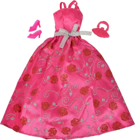 Del oblek so tudi ustrezne visoke pete in torbica, ki dopolnjujejo eleganten komplet za punčke.