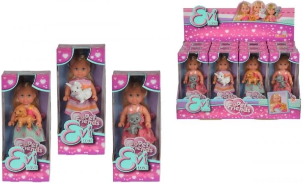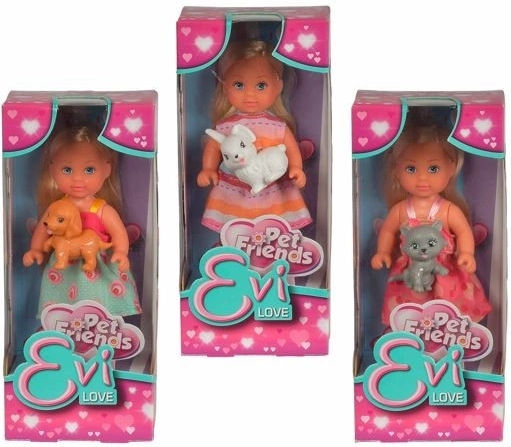 Punčka Evi Love prihaja z enim od treh ljubljenčkov, ki ponujajo različne igralne scenarije.