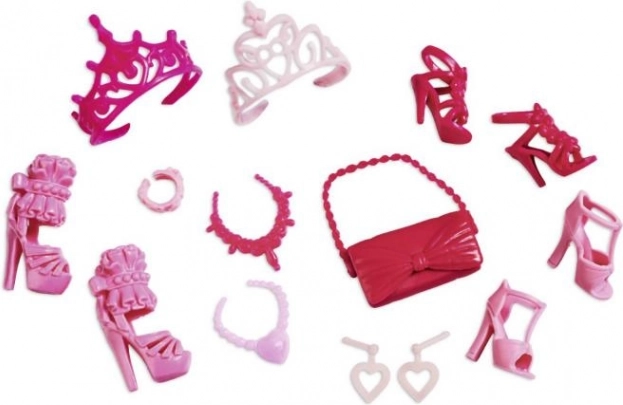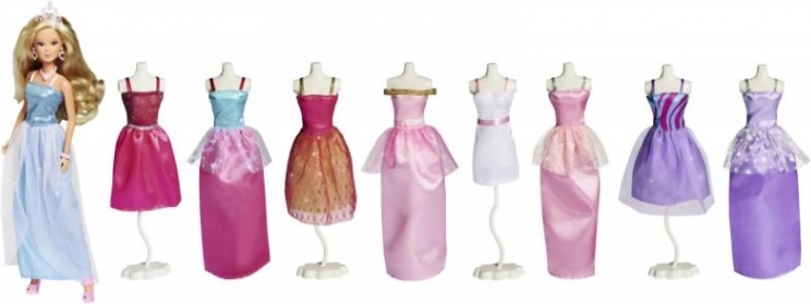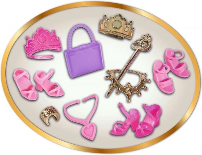 - Punčka + 8 večernih outfitov + dodatki (tiare, čevlji, torbice, nakit)