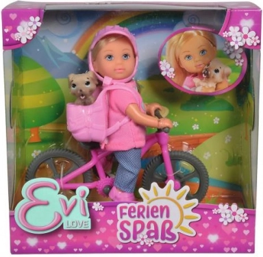 Ljubka punčka Evi je pripravljena na izlet s kolesom – ne manjka ji kolesarska čelada, stilsko kolo in zvest kužek v nahrbtniku. Idealna igrača za otroke od 3 let, ki spodbuja domišljijo in gibalne zgodbe.