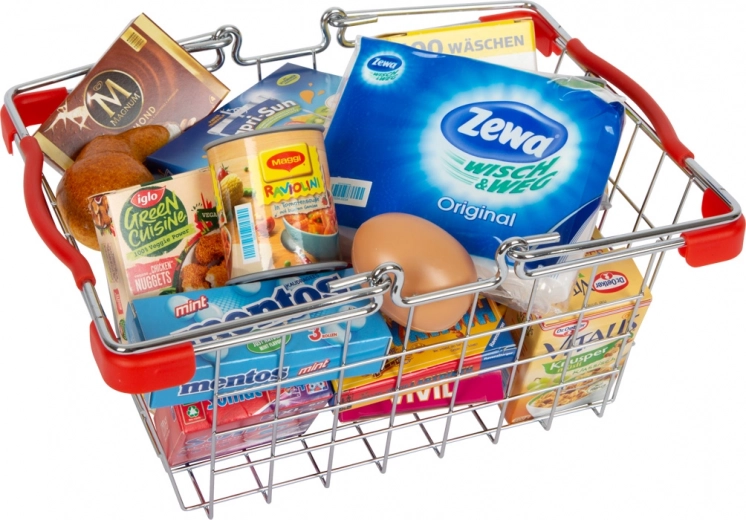 Zabavna in trpežna nakupovalna košarica za otroke od 3 let, napolnjena z maketami vsakdanjih izdelkov. Podpira igro trgovine, razvija domišljijo in socialne veščine. Kovinska izvedba z plastičnimi zaščitniki robov za večjo varnost in dolgo življenjsko dobo.