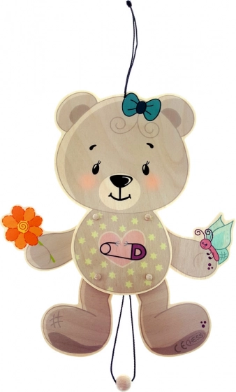 Ta viseči medvedek je idealen dodatek za vsak otroški prostor. Izdelan je iz 100 % brezovega lesa, zato je ne le trpežen, temveč tudi okolju prijazen. Njegovi gibljivi deli, ki se aktivirajo z vlečenjem za vrvico, prinašajo neskončno zabavo in razvijajo otrokove motorične sposobnosti.