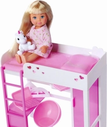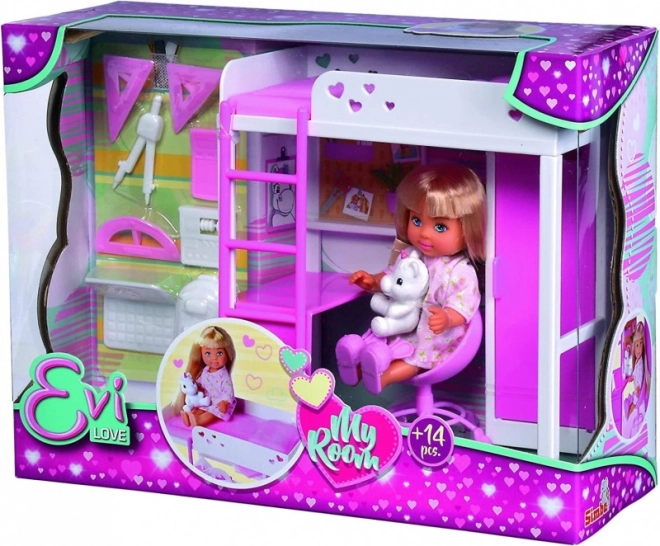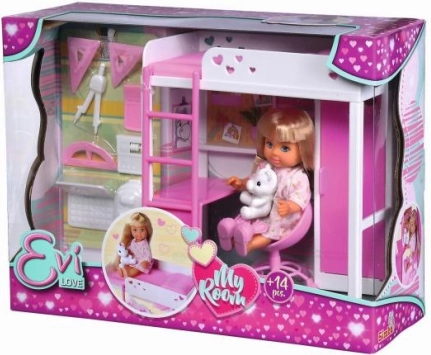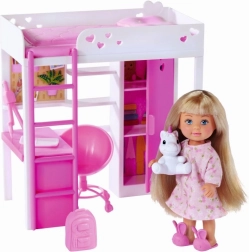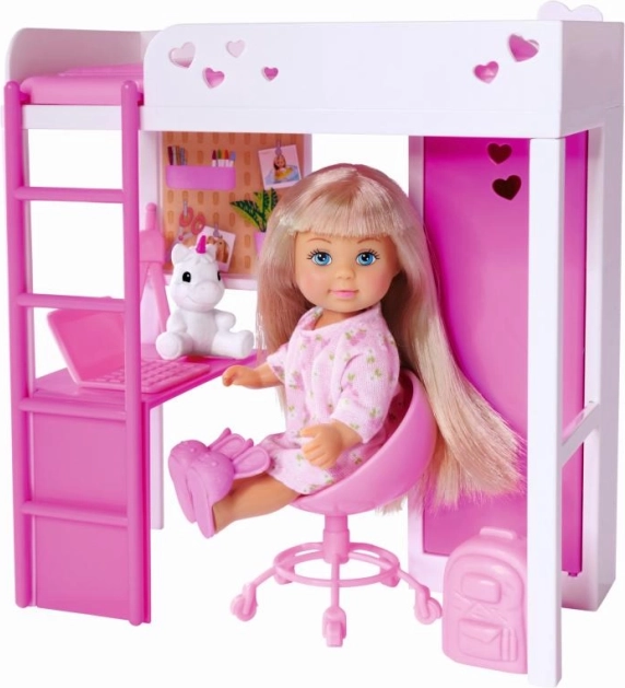 Odkrijte čarobno sobico, kjer punčka Evi preživlja čas z igro, učenjem in počitkom. Moderna loft postelja z lestvijo prihrani prostor, spodaj pa skriva udoben delovni kotiček s pisalno mizo in shranjevalnim prostorom. Vse je usklajeno v belo‑rožnati barvi z nežnimi srčki, kar bo razveselilo vsako malo oblikovalko.