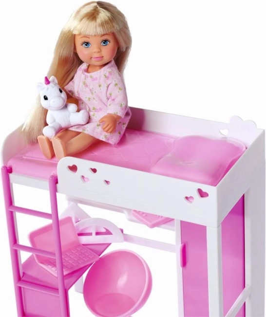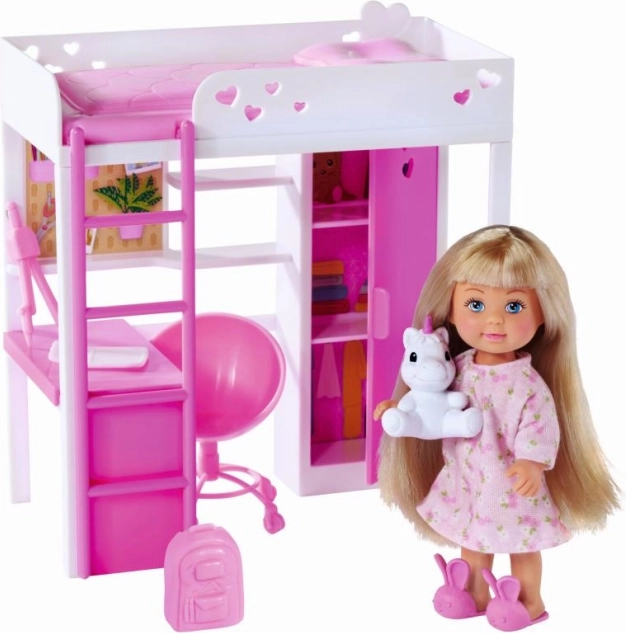 Ljubka punčka Evi Love uživa v svoji trendi sobici s pogradom, pisalno mizo in številnimi dodatki. Set v belo‑rožnati barvi z motivi srčkov vsebuje stol, prenosnik, nahrbtnik, šolske potrebščine in prikupnega samoroga. Odlično za kreativno igro in pripovedovanje zgodb za otroke od 3 let.