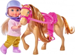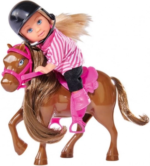 Lutka EVI nosi elegantna oblačila in dodatke, ki poudarjajo njen jahalni šarm.