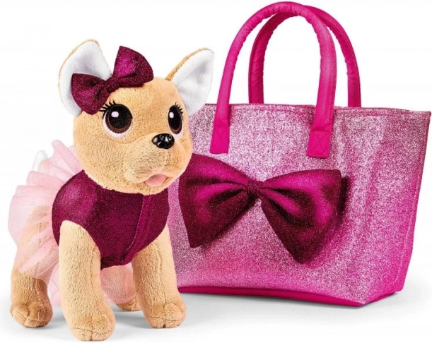 Plišasti kužek čivava z mašno v rožnatem bleščečem oblačilu in torbici z mašno. Velikost 20 cm.