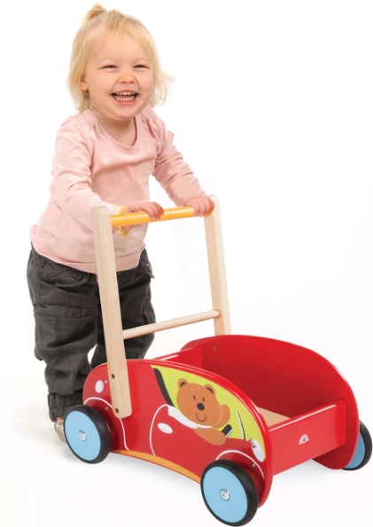 Pomagajte svojemu otroku narediti prve korake s tem edinstvenim lesenim hojčkom v obliki rdečega avtomobila, ki ima nastavljivo hitrost in tiho delovanje zahvaljujoč gumijastim kolesom, kar hkrati zagotavlja varnost in zabavo.