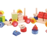Trije speti vagončki in 28 natakljivih kock ponujajo desetine kombinacij. Otroci vadijo razvrščanje barv in oblik, fino motoriko ter domišljijo.
