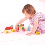 Sestavljajte in preurejajte tri vagončke z različnimi oblikami in barvami. Natakljive kocke so enostavne za prijemanje, otroci z njimi urijo prstke, razvrščajo barve in se učijo prepoznavati oblike. Ko potegnejo za vrvico, se vlak gladko požene in spremeni sestavljanje v gibalno igro.