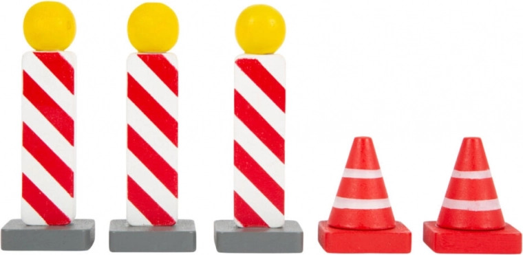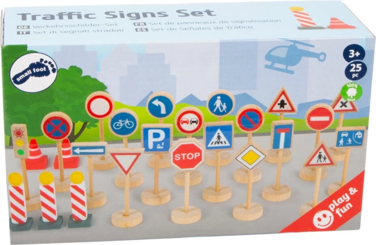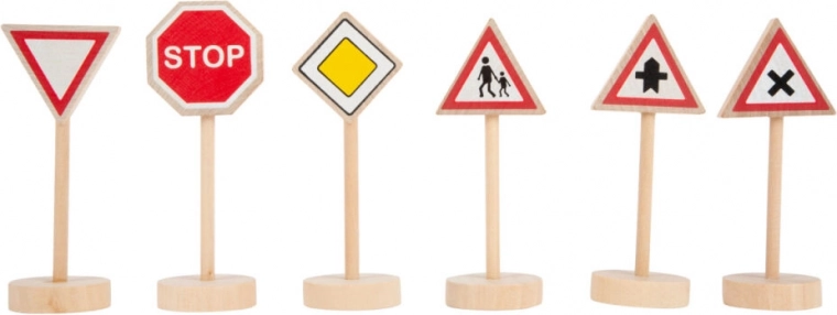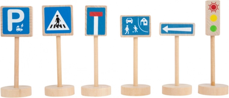 Komplet 25 lesenih prometnih znakov in dodatkov (npr. stožci) otrokom pomaga razumeti pravila cestnega prometa v realističnih igralnih scenarijih. Zaradi berljivih simbolov in stabilnih podstavkov so enostavni za uporabo ter izvrsten dodatek k prometnim preprogam in vlakovnim stezam.