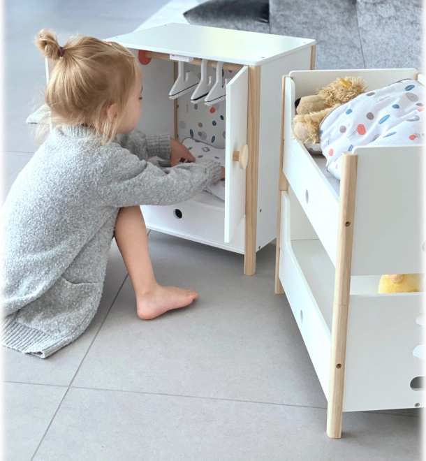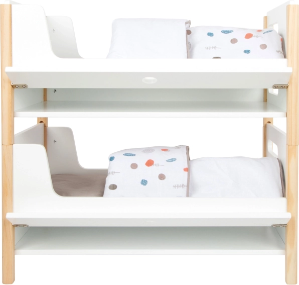 Del paketa je posteljnina v nevtralnih barvah ter prevelike odeje, ki udobno namestijo punčke ali plišaste igrače do 46 cm. Predalčki pod vsako posteljo ponujajo pameten prostor za oblačila in drobne dodatke. Idealen dodatek za otroško sobo in za stilski kotiček za punčke v okviru kolekcije Little Button.