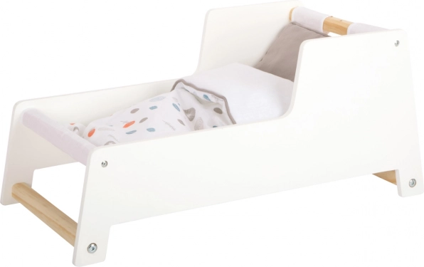 Stilska zibelka za punčke v nordijskem slogu za otroke od 3 let. Ponuja stabilno leseno konstrukcijo, zibajoče sani, zlahka snemljiv baldahin in obojestransko, spolno nevtralno posteljnino. Pod veliko odejo udobno spijo punčke in plišasti prijatelji do 46 cm. Elegantni pastelni toni in zaobljeni robovi se odlično podajo v sodobno otroško sobo.