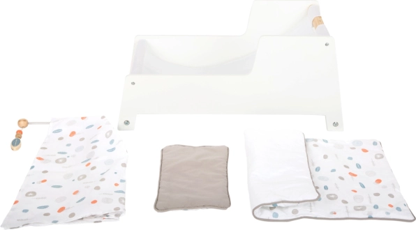 V kompletu je obojestranska, nevtralno barvno usklajena posteljnina ter velika odeja, pod katero se udobno namestijo punčke ali plišasti prijatelji do 46 cm. Nežne barve in minimalistične linije jo naredijo za okusen dodatek vsakemu interierju ter spodbujajo kreativno in posnemovalno igro.