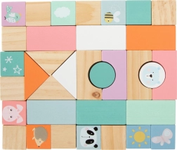 • 34 lesenih kock v naravnih in pastelnih odtenkih za ustvarjalno gradnjo