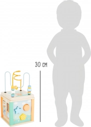 Ta lesena motorična kocka v sodobnih pastelnih barvah iz linije »Pastel« navdušuje z visokim deležem lesa, prikupnimi živalskimi motivi in skrbno izdelavo. Otroci se lahko igrajo z vseh petih strani ter naravno urijo koordinacijo oko–roka, potrpežljivost in prostorsko predstavo.