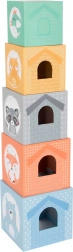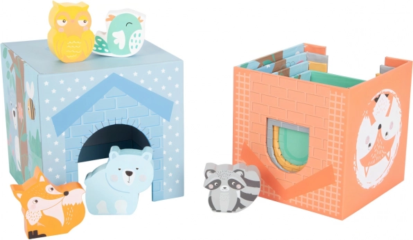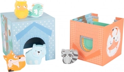 Kocke lahko postavite v visok stolp ali jih vstavite eno v drugo. Okenca in vratca vabijo k skrivalnicam z živalicami ter razvijajo domišljijo in fino motoriko.