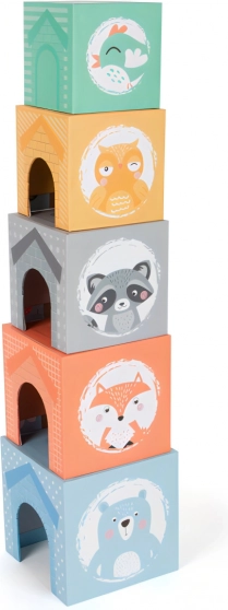 Zložljivi stolp »Pastel« združuje čvrste kartonske kocke z lesenimi živalicami v sodobnem pastelnem dizajnu. Vsaka stran kock ponuja namig za pravilen vrstni red, zato se otroci skozi igro učijo razvrščanja in prostorskega zaznavanja. Zahvaljujoč okencem in vratcem lahko živalice »stanujejo« v notranjosti, kar spodbuja domišljijo in igro vlog.