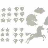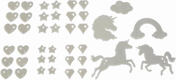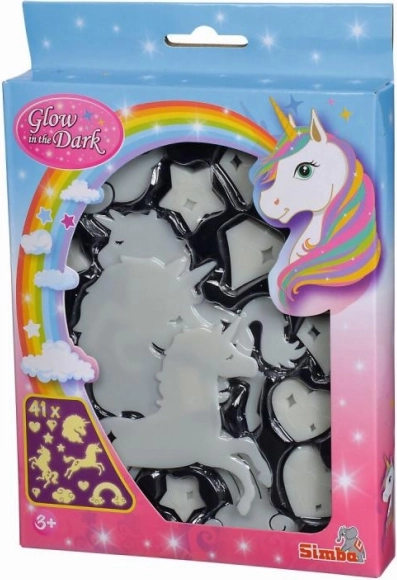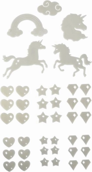 Razsvetlite otroško sobo s setom svetlečih dekoracij za temo z motivom samoroga in drugih podob. Po kratkem osvetljevanju svetijo v temi in se enostavno pritrdijo na steno, strop ali pohištvo. Pakiranje vsebuje 41 kosov in lepilno gumo za preprosto namestitev.