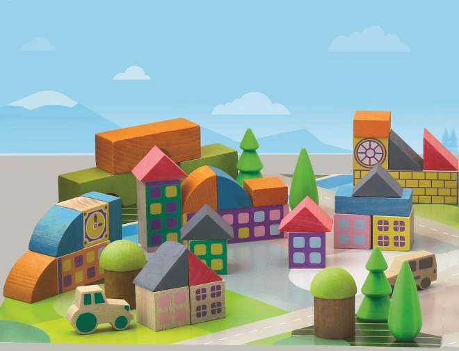 - 40 lesenih kock + igralna podloga za gradnjo vasice