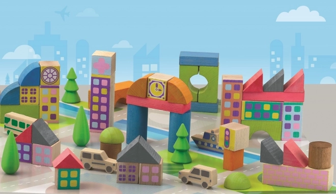 Ta kakovostna lesena sestavljanka je idealna izbira za prve gradbene projekte. Zaradi raznolikih oblik in barvnih potiskov bodo otroci zlahka zgradili hiške, ulice in celo mestece. Del kompleta so tudi preprosta lesena vozila in igralna podloga, ki igri dodajo zgodbo ter spodbujajo razvoj domišljije.