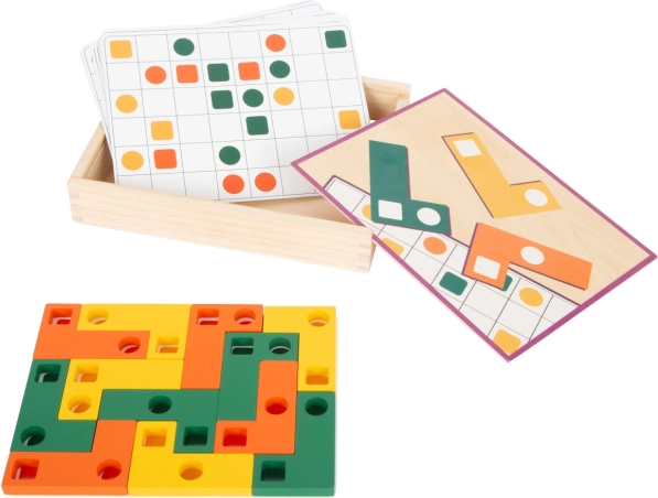 Ta lesena logična igra SMALL FOOT ponuja otrokom zabavne izzive in pametno učenje. Koščki z različnimi odprtinami se polagajo na igralne kartice po predlogah, zato otroci urijo natančnost, potrpežljivost in strategijo sestavljanja. Zaradi živih barv in oblik je igra privlačna in enostavno razumljiva.