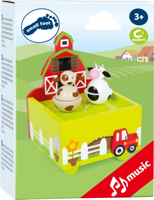 Prisrčna glasbena skrinjica z motivom kmetije znamke small foot otrokom prinaša mirno uspavanje. Ob melodiji pesmi »Striček Donald je imel kmetijo« se figurici krave in kužka nežno vrtita. Zahvaljujoč kakovostnemu lesu, vzdržljivi izdelavi in navijalnemu mehanizmu je to čudovit dodatek vsake otroške sobe.