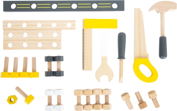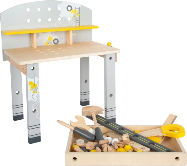 Miza vsebuje žago, primež, izvijače in druga orodja, ki otrokom omogočajo posnemanje pravih gradbenih projektov.