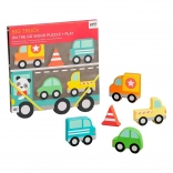 Robustne lesene puzzle za malčke z motivom velikega tovornjaka. Zabavna igrača, ki razvija motorične spretnosti in kreativno razmišljanje otrok.