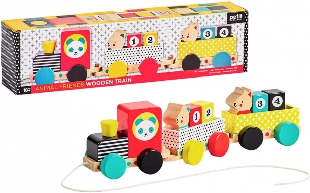 Ta sodoben leseni vlak ima lokomotivo in dva vagončka, štiri kocke s številkami ter dva prikupna živalska prijatelja. Otroci ga lahko vlečejo za vrvico, gradijo in premeščajo kocke ter figurice, pri tem pa razvijajo domišljijo, logiko ter fino in grobo motoriko.