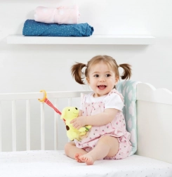 Enostavno pritrjevanje na posteljico ali avtosedež omogoča, da je igrača vedno pri roki, kar prispeva k zabavi na poti in doma.
