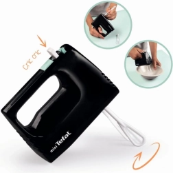 Mini mešalnik Tefal Express je idealen dodatek za vsak otroški kuharski set. Metlice se mehansko vrtijo s pritiskom na gumb in ne potrebujejo baterij.