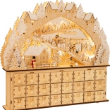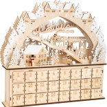 Doživite čar božiča z lesenim adventnim koledarjem, ki prikazuje slikovito vasico! Podrobnosti, kot so snežne hiške, drevesca, smučarji in snežak, vam bodo vsak dan prinesle veselje. Predalčke koledarja lahko napolnite z majhnimi darilci ali sladkarijami za otroke.