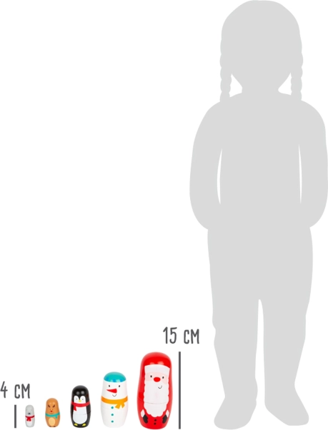 Prisrčen komplet lesenih matrjošk z motivi Božička, snežaka, pingvina, severnega jelena in medveda v dom prinese božično vzdušje. Otroci bodo uživali v zabavnem vstavljanju in zlaganju, ki razvija fino motoriko in usklajenost oko–roka. Idealna božična dekoracija in darilo za otroke od 3 let dalje.