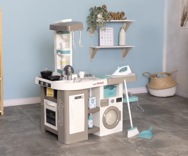 Večnamenska otroška kuhinjica SMOBY TEFAL Studio 2 v 1 združuje kuhanje, pranje in likanje v enem igralnem setu. Ponuja elektronsko kuhalno ploščo z zvoki, pečico, hladilnik, pomivalno korito in kavni avtomat, hkrati pa tudi pralnico s pralnim strojem, sušilnim stojalom in likalno desko z mehansko likalnikom. Del kompleta je 36 dodatkov za realistično igro in razvoj otroške domišljije.