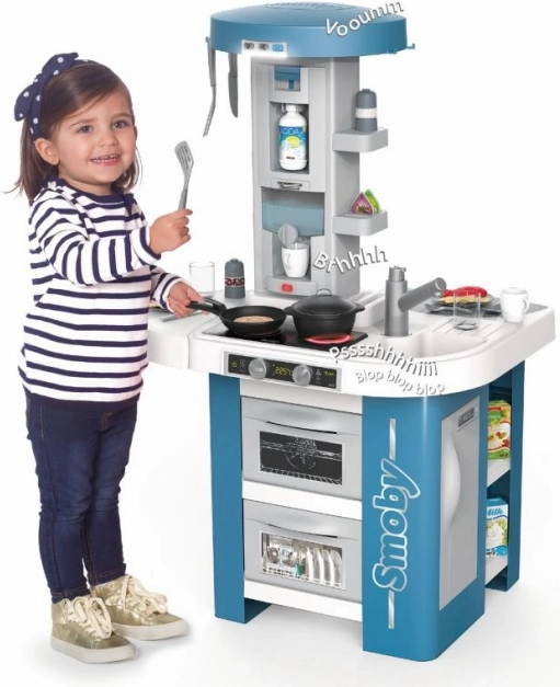 Kuhinjska plošča je opremljena z moderno elektronsko kuhalno ploščo z dvema zvokoma kuhanja in rdečo lučjo za simulacijo pravega kuhanja. Interaktivni kavni aparat z napolnljivim rezervoarjem posnema proces priprave kave, medtem ko napa ponuja tri nivoje hrupa skupaj z osvetlitvijo.