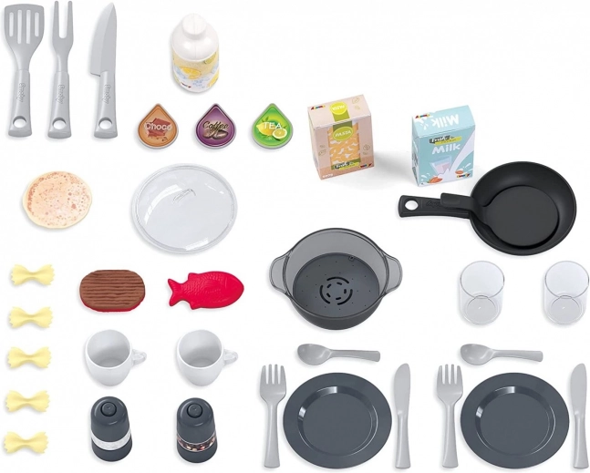 Priložen je bogat komplet 34 kosov dodatkov – lonec s pokrovko, ponev za palačinke, mlinček za sol in poper, posoda in pribor za dve osebi, kapsule za kavni aparat, kuhinjski pripomočki, košara za pomivalni stroj in makete živil. Vrtljiva krmilna kolesca, odpirajoča se vratca pečice in hladilnika ter značilen zvok »cric cric« pri izdelovalcu sode podpirajo realistično igro.