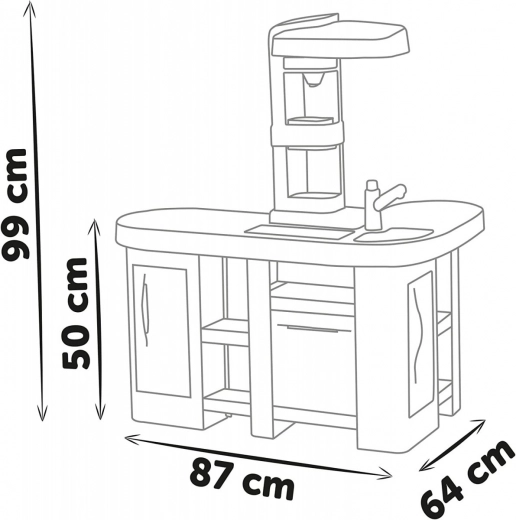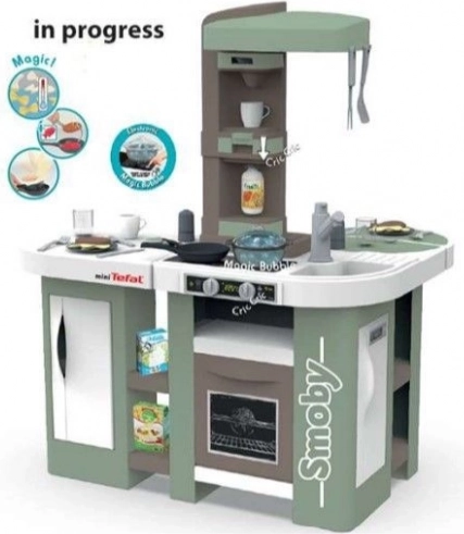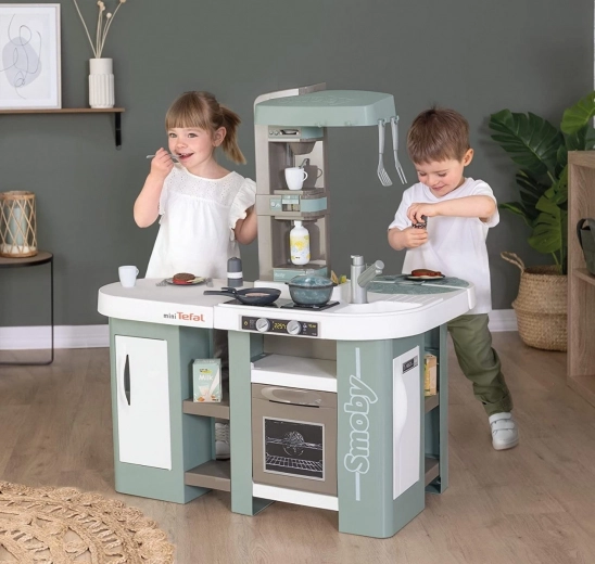 Ta prostorna kuhinjica, navdihnjena z znamko TEFAL, ponuja vse za pristno igro: delovno ploščo, umivalnik z armaturo, kavni aparat na kapsule, izdelovalec gaziranih pijač, pečico, pomivalni stroj, hladilnik in odprte police. Elektronska funkcija magičnega lonca po dodani vodi in pritisku na gumb ustvari prave mehurčke, ki navdušijo vsakega malega kuharja.