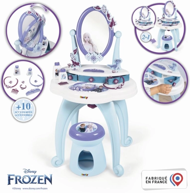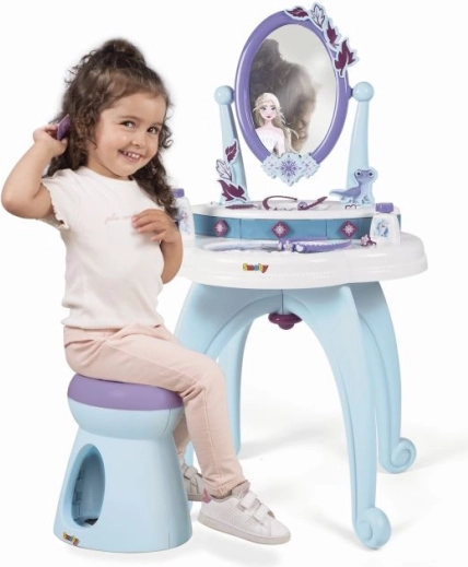Toaletna miza 2v1 navdihnjena z Ledenim kraljestvom ponuja vse, kar majhne princese potrebujejo za svojo vsakodnevno nego. Vključuje veliko vrtljivo ogledalo in bogato opremo, kot so parfumi in drugi kozmetični dodatki.