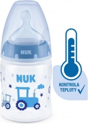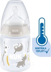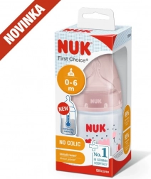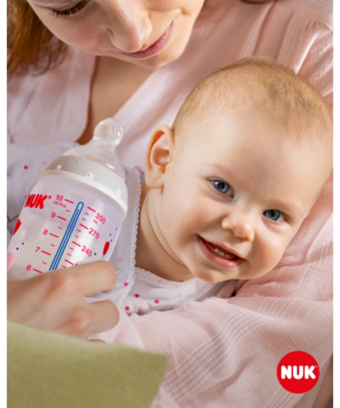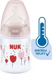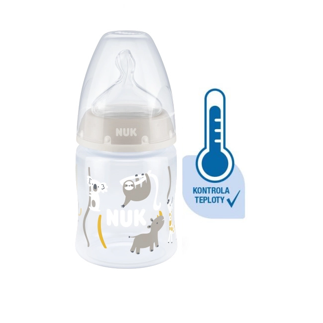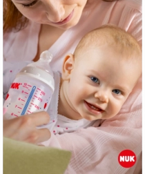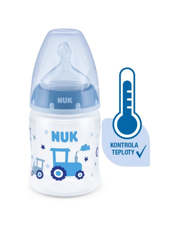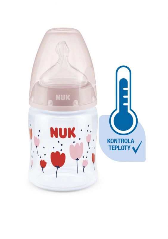 Kontrola temperature pomaga staršem doseči optimalno temperaturo in tako zagotoviti varno hranjenje njihovega otroka. Mirno in varno hranjenje zahvaljujoč kontroli temperature. Ko je otrok lačen, kašica v steklenički ne sme biti niti prevroča niti prehladna. Zato mame in očetje pred vsakim obrokom preverjajo temperaturo obroka. Prepoznati pravo temperaturo ni vedno enostavno. Zato so bile razvite dojenčke stekleničke NUK First Choice+ s funkcijo kontrole temperature. Ta funkcija v takšni obliki doslej še ni bila predstavljena. Dojenčke stekleničke NUK First Choice+ so zdaj opremljene z novo temperaturno indikacijo, ki pomaga preprečiti, da bi vaš otrok pil prevroč obrok. Indikator izgleda kot termometer, nameščen je med merilnimi črtami in temperatura vsebine stekleničke spremeni njegovo barvo. Ta funkcija pomaga staršem doseči optimalno temperaturo pri hranjenju njihovega otroka. Če je obrok prevroč, se modri indikator spremeni v belo. V idealnem primeru naj bi imel obrok telesno temperaturo (37 °C), kar ustreza modri barvi prikaza. Pozor: kontrola temperature je namenjena dodatnemu preverjanju. Pred hranjenjem je potrebno temperaturo preveriti tudi ročno. Za preverjanje priporočamo, da kanete nekaj kapljic vsebine stekleničke na notranjo stran zapestja. Najbolj naravna cuclja za vašega otroka. Že vrsto let so stekleničke First Choice prva izbira za hranjenje po vzoru dojenja. S stekleničkami First Choice+ smo se še bolj približali naravi – omogočajo zdrav razvoj čeljusti in otroku dajejo občutek, kot da pije iz materine dojke. Naravno in pravilno oblikovano za čeljust. Edinstvena oblika cucelj NUK je oblikovana po materini bradavici med dojenjem. Cuclja pušča dovolj prostora za naravne sesalne gibe jezika in čeljusti vašega otroka. Mehko kot materina dojka. Silikonska cuclja je zahvaljujoč novi mehki coni bolje prilagojena nebu vašega otroka in zagotavlja naraven občutek pri pitju. Preprečuje kolike. Izboljšan sistem proti požiranju zraka Anti-Colic Air System zagotavlja enakomeren pretok tekoče hrane brez požiranja zraka. Klinično preizkušeno. Zaradi izjemno naravne oblike cuclje jo dojenčki zelo dobro sprejemajo. To pomeni, da je še posebej primerna za dojenčke, ki so hkrati dojeni in hranjeni po steklenički. Dojenčka steklenička. praktičen NUK prikaz kontrole temperature, ki spremeni barvo iz modre (hladno) v belo (prevroče) brez škodljivih snovi in vonja – ne vsebuje BPA. Enostavno polnjenje in čiščenje – ekstra široko grlo stekleničke. Varno držanje in stabilnost – zaradi nežno oblikovane stekleničke in širokega dna. Neomejeno število kombinacij – združljiva z vsemi izdelki NUK First Choice. Znanstvena študija: Moral in sod. BMC Pediatrics 2010, 10:6. Več informacij najdete na strani http://nuk.com/research. Neodvisna tržna raziskava z 205 pediatri, Nemčija 2018. 99 % mater je potrdilo, da steklenička NUK First Choice+ Control ne povzroča kolik. Glavne lastnosti: temperatura vsebine stekleničke spremeni njeno barvo: če je obrok prevroč, se modri indikator spremeni v belo; idealno za otroško čeljust, cuclja iz posebej mehkega silikona, 0–6 mesecev M (srednja odprtina = za otroško hrano); klinično preizkušeno: za optimalno kombinacijo dojenja in hranjenja po steklenički; privlačen dizajn