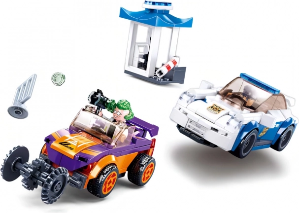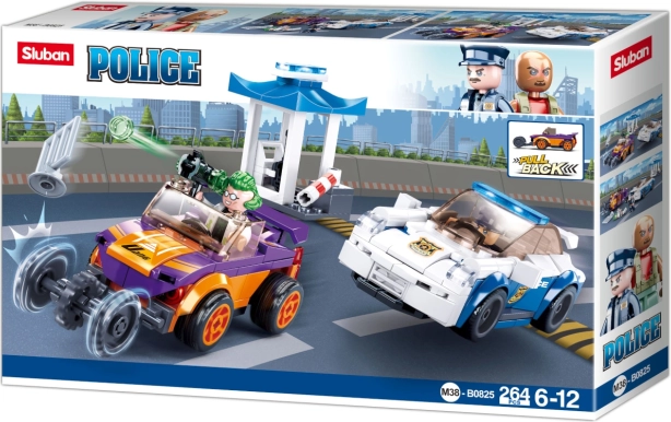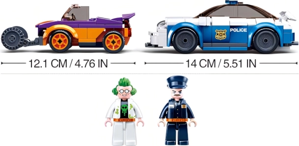 Komplet vsebuje dve vozili – belo-modri policijski avto in izvirno pisano vozilo, prav tako z navijalnim mehanizmom. Vsak avto ima edinstvene podrobnosti, dizajn in velikost, kar omogoča nešteto igralnih scenarijev.