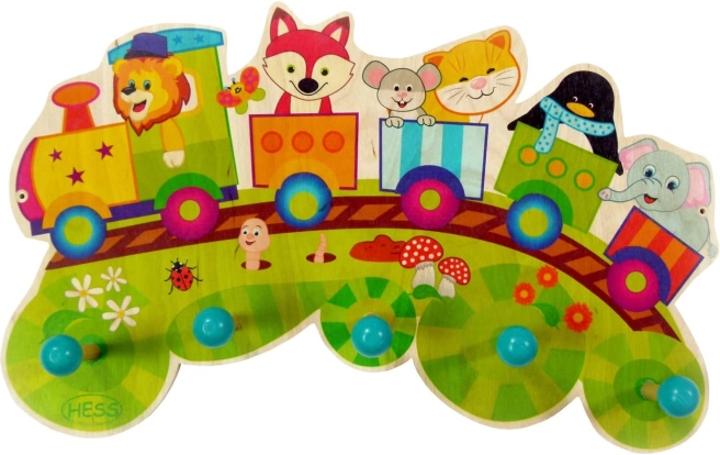 Privlačen barvit obešalnik za otroško sobo ali hodnik z motivom vlakca in petimi kljukami za obešanje oblačil. Izdelan iz okolju prijaznega lesa, uporabljene so ekološke barve.