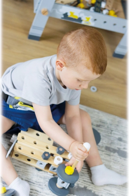 V paketu je bogata oprema: konstrukcijske letve in plošče s predvrtanimi luknjami, kocke, kolesa, adapterji za kolesa, distančna pušica ter dve leseni orodji – ključ in izvijač. Vse pregledno shranite v praktični box, zato se noben delček ne izgubi.
